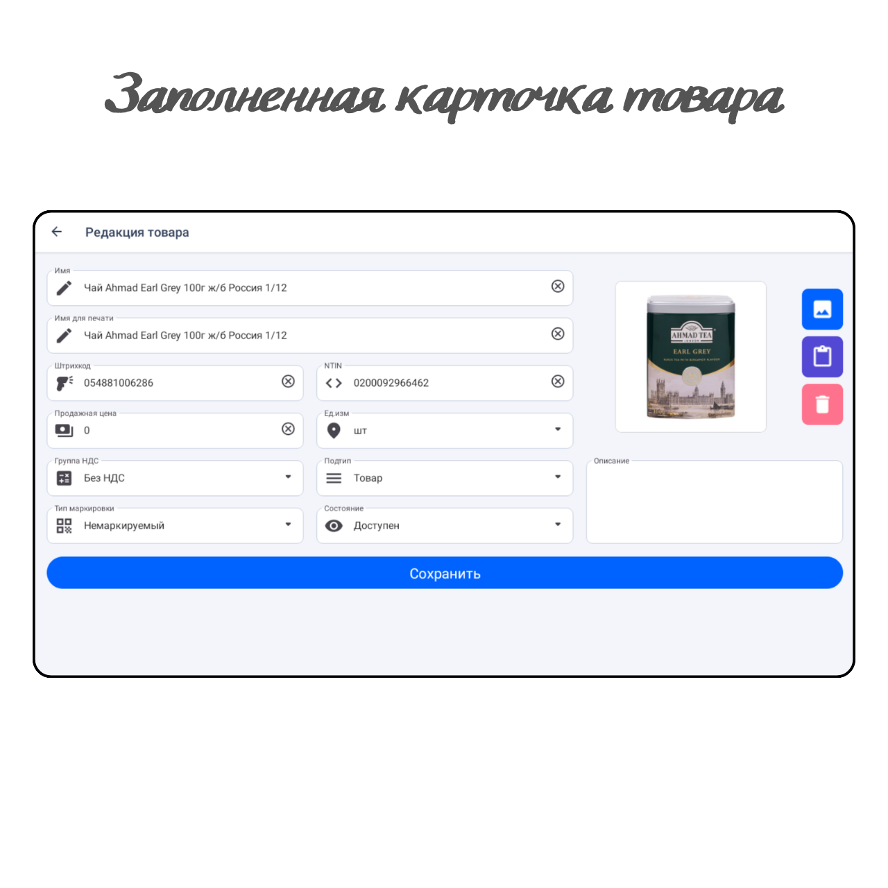 Для быстрого создания товара считайте его штрихкод в поле "Штрихкод". Программа произведёт запрос к НКТ и электронному каталогу для получения данных по товару, после этого основные поля будут заполнены. Останется заполнить цену товара и сохранить карточку товара.