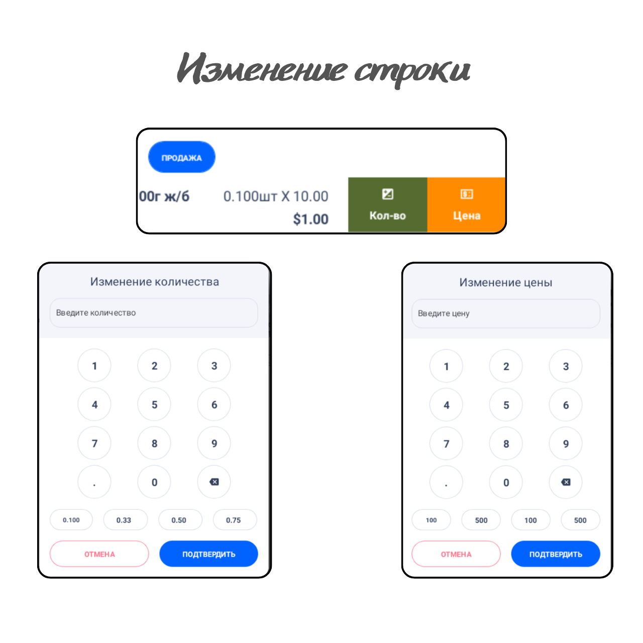 Для изменения цены или количества товара смахните строку с товаром влево.