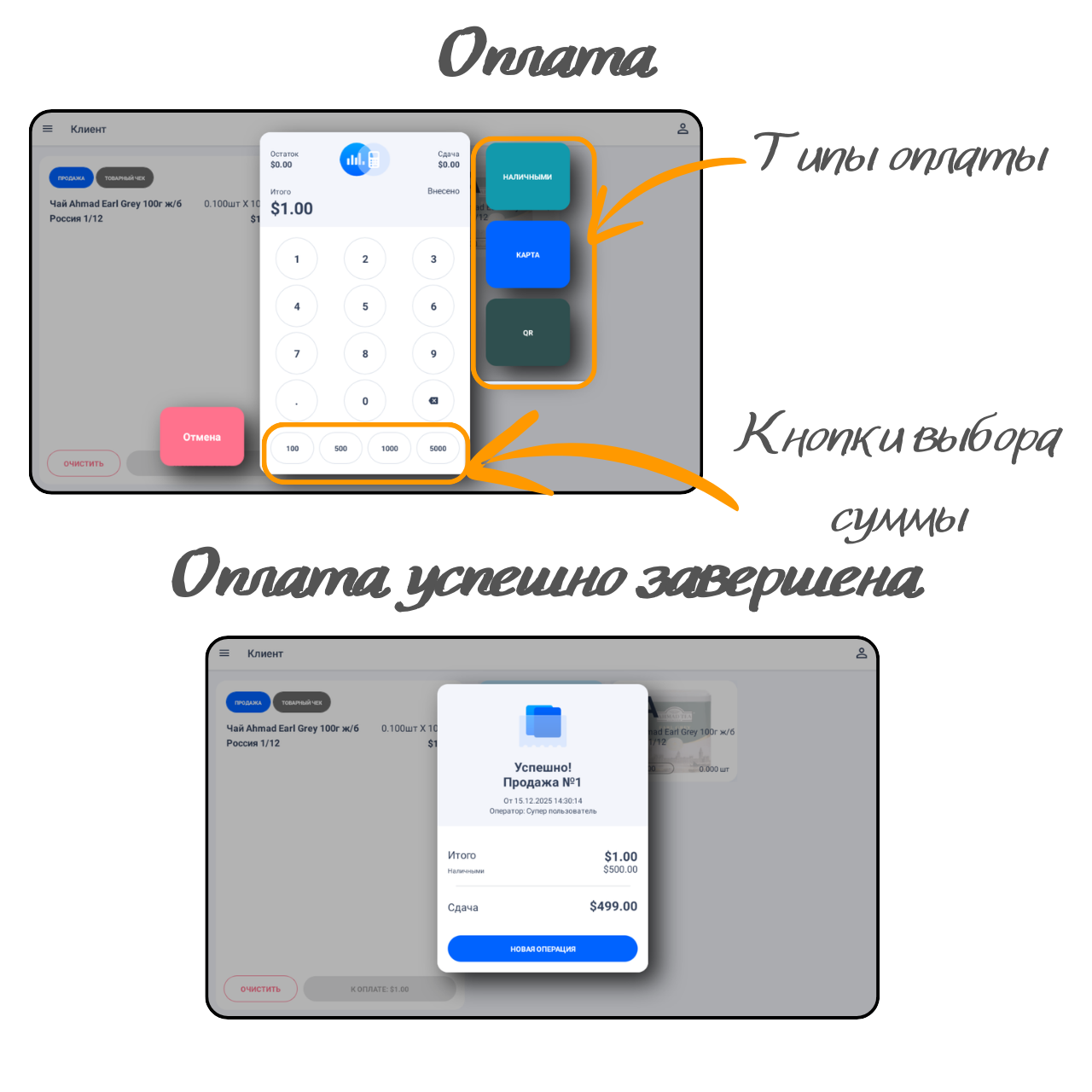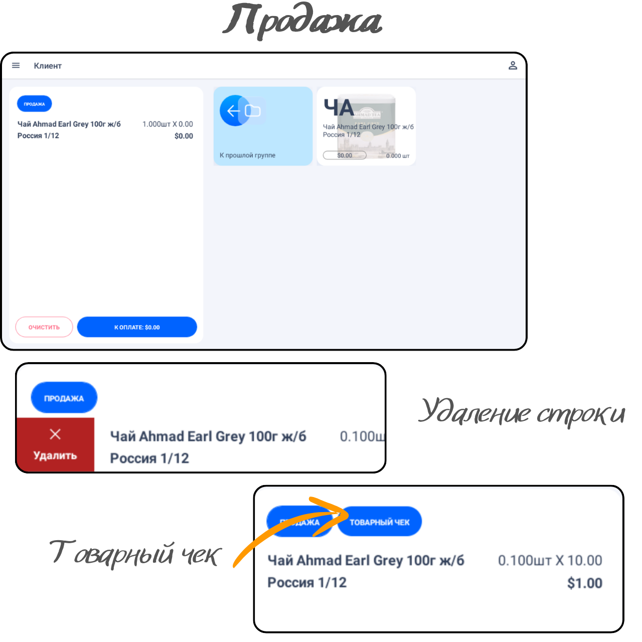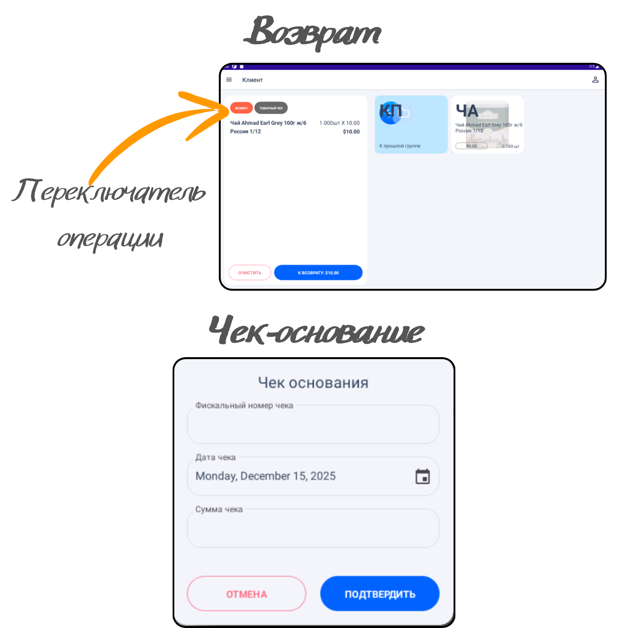Оформление возврата происходит аналогично операции "Продажа". Для оформления возврата товара переключите тип операции на "Возврат"