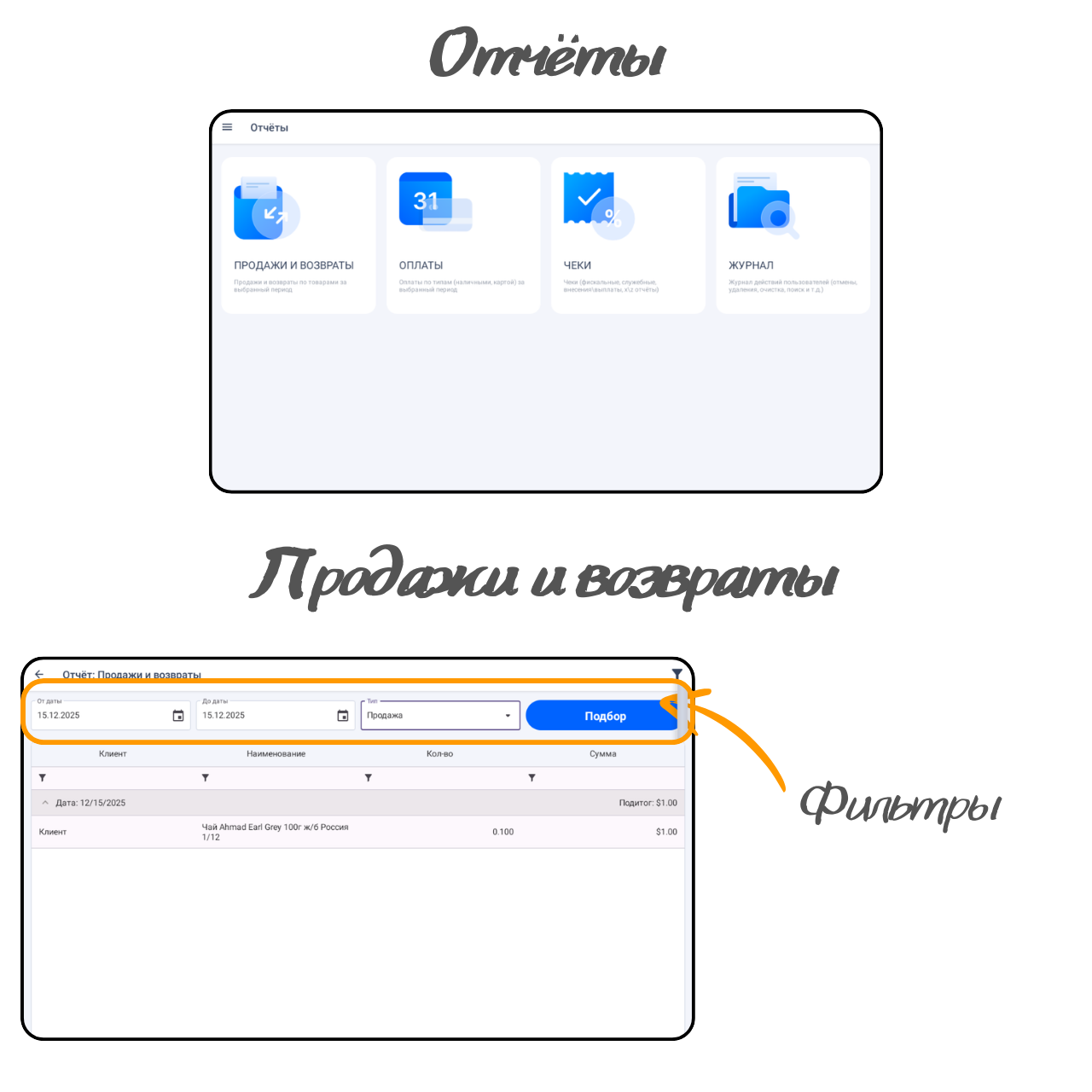 Продажи и возвраты. Отчёт показывает информацию о выполненных операциях.