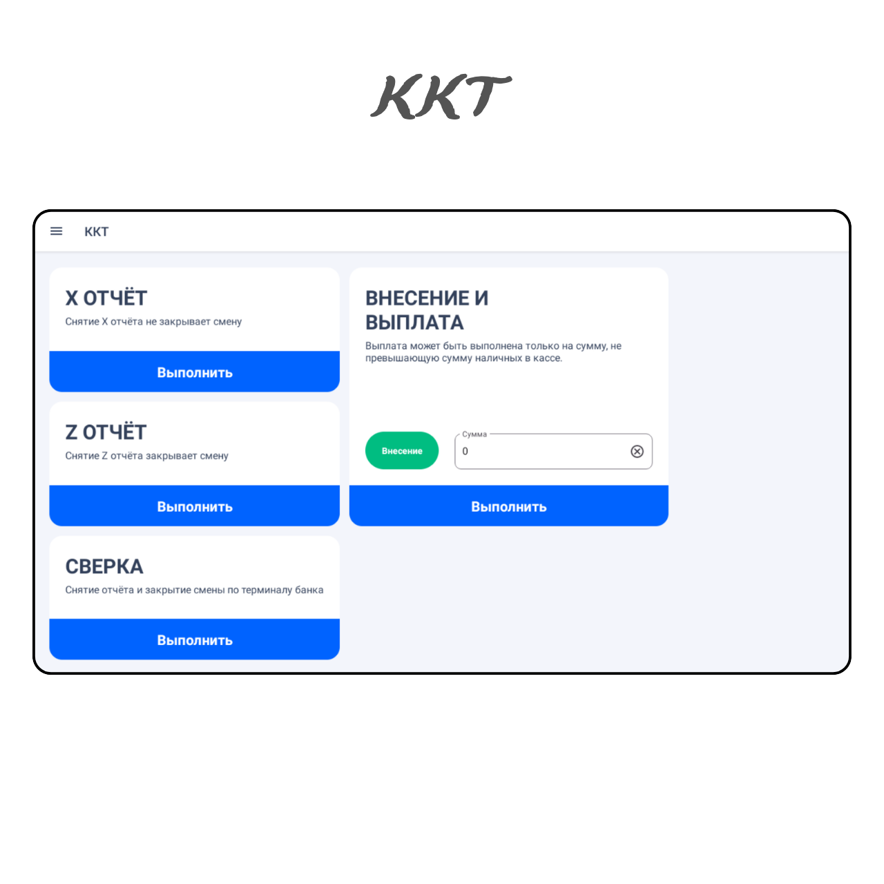 В данном окне выполняются отчёты устройств, внесение и выплата наличных.