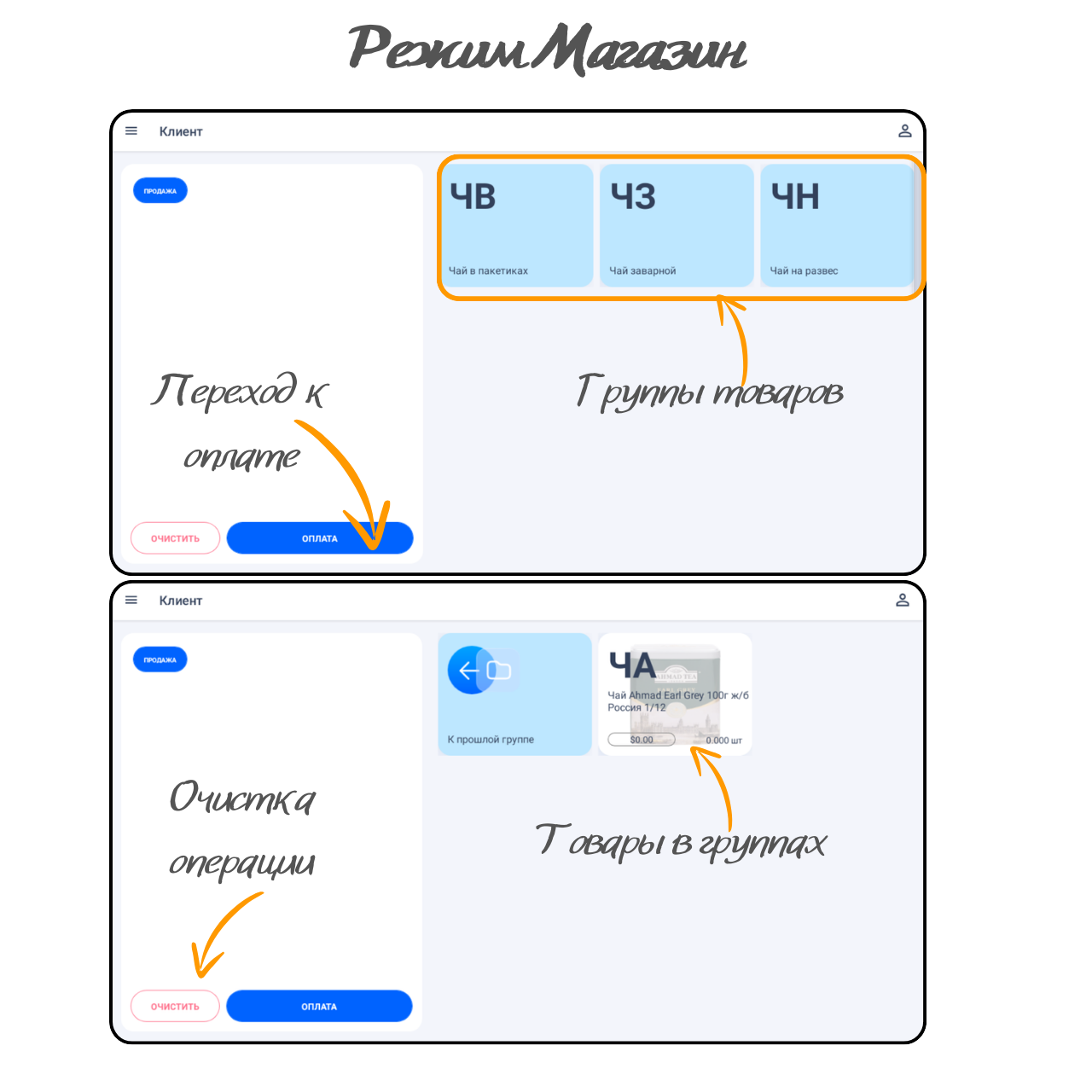 После изменения данных в справочниках необходимо обновить данные в режиме «Магазин». Для обновления потяните экран с товарами вниз.